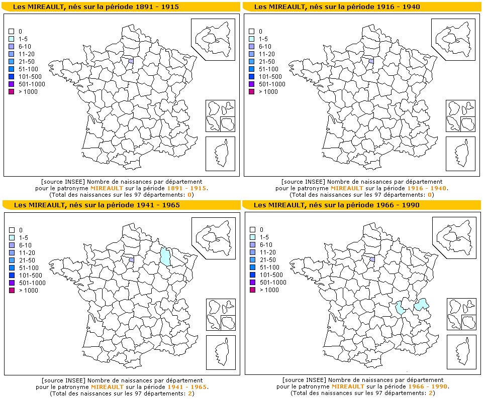 Nombre de naissances Mireault en France de 1890 à 1990
